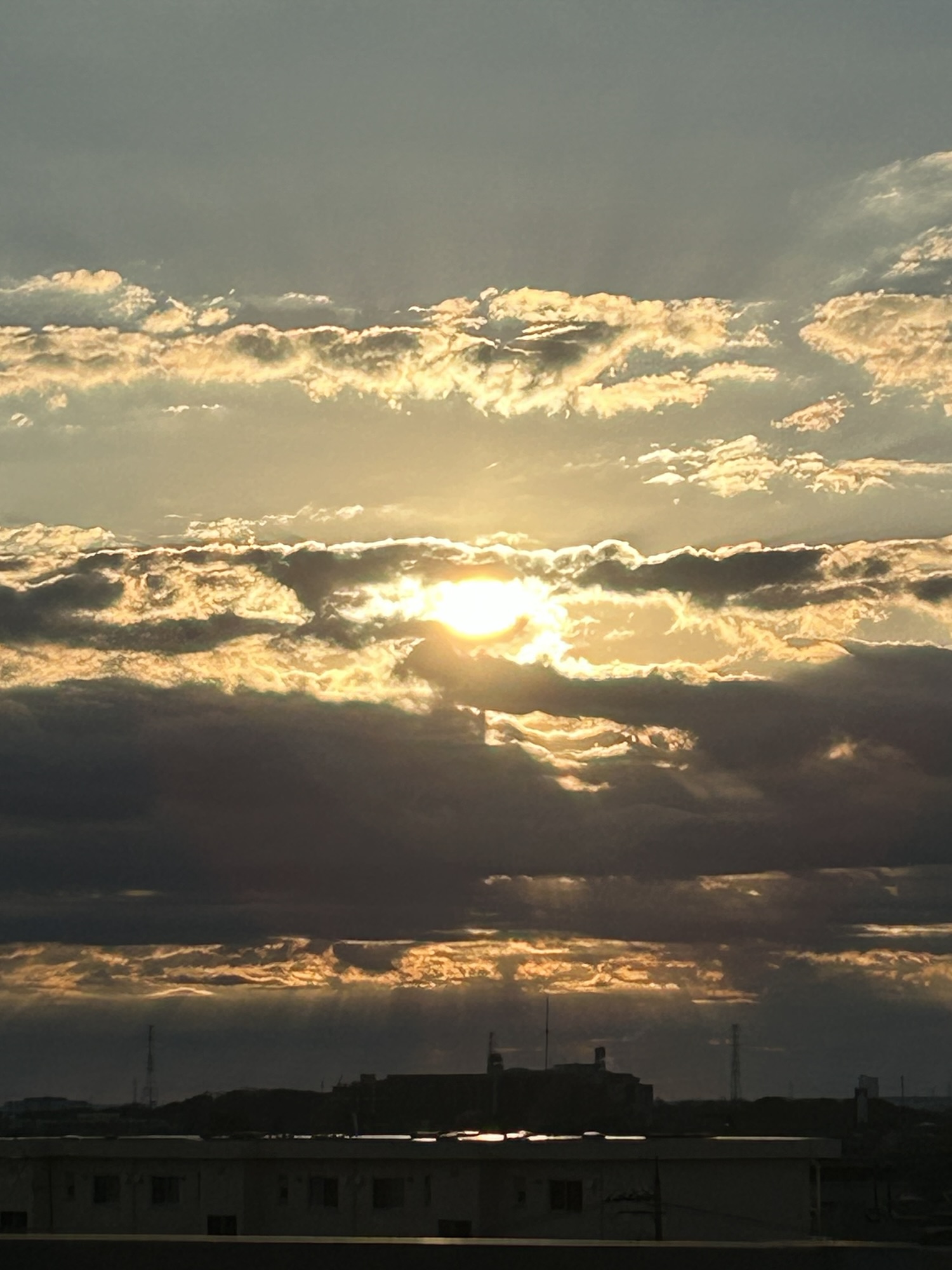 まずは、歩いて5分の陸橋の上から初日の出を拝みます。今日は分厚い雲が低く垂れ込めていたので綺麗に見ることができませんでしたが、少し粘って眩しいご来光を拝みました。
